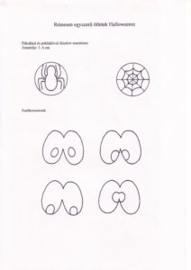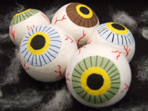 A szemekhez használjunk 3. 5 és 4 cm átmérőjű papírmasé vagy hungarocell gömböket. A gömbre körzővel rajzoljunk egy 0. 8 cm átmérőjű kört, majd egy 1. 2 és 2. 6 cm átmérőjű kört. Mindhárom körnek azonos legyen a közepe. A belső kört fessük feketére, a középsőt sárgára, a külsőt pedig a valódi szemeknek megfelelően, kékre, zöldre vagy barnára. A szem külső részére fekete filctollal rajzoljunk vonalakat. A szemgolyó köré elszórtan, piros filctollal rajzoljunk hosszabb-rövidebb ereket. A szemeket tálba, sütemények közé tehetjük, de cérnaszálra is fűzhetjük őket, amit az ablak elé akaszthatunk.
