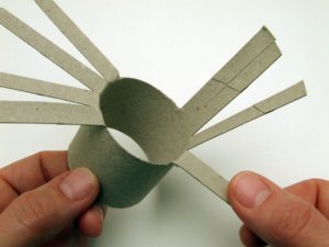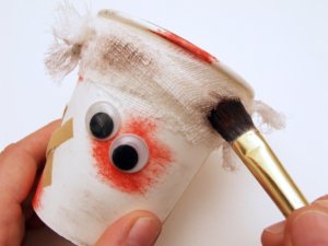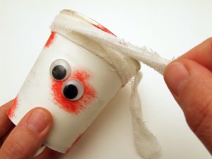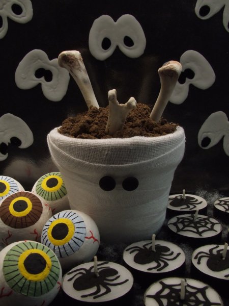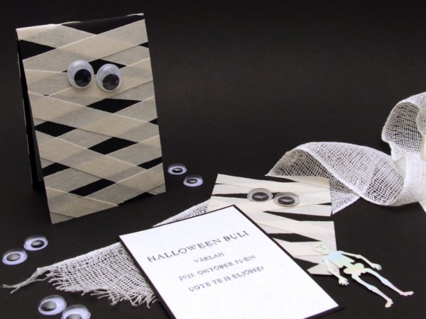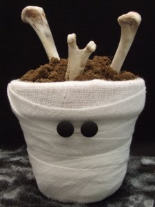 Tetszőleges méretű cserepet tekerjünk körbe patikában kapható gyosrskötöző pólyával (gézzel). Először a cserép alját vonjuk be a gézzel. Ehhez a gézből vágjunk le 3-4 darab, a cserép aljánál 1 cm-rel nagyobb átmérőjű kört. Ezeket ragasszuk a cserép aljára, és a felesleget ragasszuk a cserép oldalára. A maradék gézt tetszőlegesen, több rétegben tekerjük körbe a cserép oldalán. Néhány helyen, hogy a géz ne csússzon el, ragasztóval rögzítsük a cseréphez. A szemeknek ragasszunk egy-egy darab fekete füles gombot. A kész cserép belsejébe tehetünk cukorkákat, önthetünk bele gyertyát, vagy morbidabb változatban virágföldet is önthetünk bele, amelybe néhány kisebb csontot szúrhatunk.