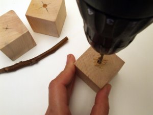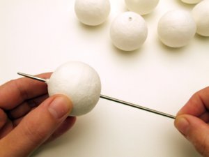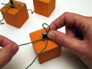 4. A zsinórból vágjunk le egy tetszőleges hosszúságú részt az akasztónak. Hajtsuk félbe, és a végét csomózzuk meg. A kukoricaszem oldalának a tetejére szúrjunk egy lyukat, és belülről fűzzük át rajta a zsinórt.