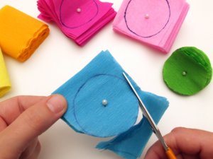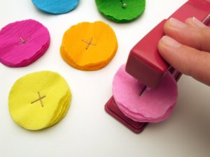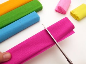 7. A krepp-papírokból vágjunk le 4 cm-es darabokat, majd hajtogassunk ki, és egymástól egyenlő távolságban vagdossunk be.