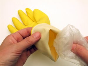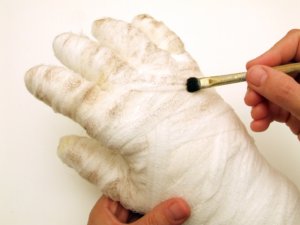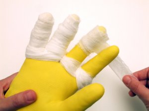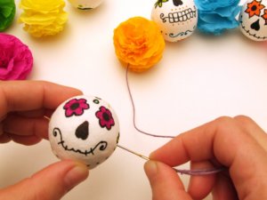 9. A bevagdosott csíkokat a pinata aljától kezdve, egészen a tetejéig körben ragasszuk fel. Alulra ragasszuk a sárgát, majd ezután a narancssárgát, végül pedig a fehéret. Ragasztóval közben több helyen rögzítsük, hogy a papír ne csússzon el.