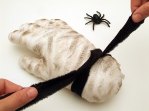 Kellékek: hullámkarton, színes krepp papírok (fehér, sárga, narancssárga), fehér zsinór, ragasztószalag, ragasztó, különböző töltelékek: színes cukorkák, apró csokik, konfetti, kisebb Halloween dekorációk
