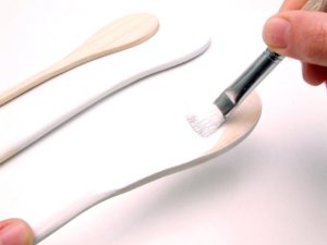 1. A fakanalat festés előtt, ha kell, finom csiszolópapírral csiszoljuk át, hogy mindenhol sima felülete legyen. Ezután a fakanalat teljes egészében fessük be fehér színű festékkel. Ha az első réteg festék nem fedi be teljesen, száradás után fessük be még egy-két rétegben. A fakanalat hagyjuk teljesen megszáradni.