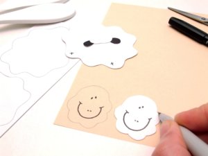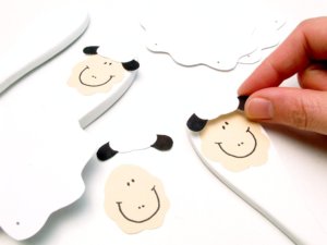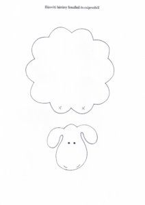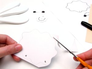 3. A bárány testének és a feje tetejének a sablonját helyezzük a fehér kartonpapírra, a testszínű papírra pedig a bárány pofijának a sablonját, és rajzoljuk körbe. A mintákat, jelöléseket is halványan jelöljük át. A papírból vágjuk ki őket, és a bárány pofiján lévő mintákat, és a füleket fekete filctollal rajzoljuk át. Az esetleges ceruzavonalakat óvatosan radírozzuk le.