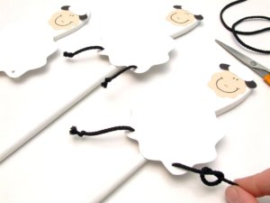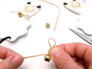 6. A raffiászálból vágjunk le egy 15 cm-es darabot, fűzzük át a csengettyűn, és a raffiát kössünk masnira. A csengettyűt ragasszuk a bárány nyakához.