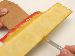 1. A fából készült madárijesztő táblarészét fessük drapp színűre, majd száradás után szivaccsal vigyünk fel rá okkersárga színű festéket, amit elszórtan nyomogassunk a falapra. Ezután egy ecsettel a széleket is húzzuk át ugyanezzel a színnel. Ezáltal kicsit foltos, de egybeolvadó felületet kapunk.