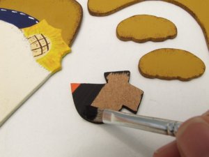 2. Ezután a fölötte lévő madárijesztőt és a kisebb részeket is fessük be. Az arcát fessük testszínűre, a ruháját pedig zöldre. A kalapnál lévő napraforgót fessük sárgára, és a közepét rácsosan fessük be. A kalapjára fessünk egy szélesebb kék csíkot fehér vonalakkal, majd a kalap többi részét és a kezeit fessük okkersárgára. Az orrát fessük bordóra, a varjú csőrét narancssárgára, a többi részét pedig feketére. Fehérrel fessünk rá szemet. A kalap és a kezek széleit húzzuk át barna festékkel.