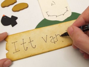 5. A madárijesztő orrát ragasszuk a szemek alá, majd a raffiából vágjunk le néhány szál, kb. 4 cm hosszú darabokat, és ragasszuk a madárijesztő arca köré. A kalap karimáját ragasszuk a madárijesztő fejéhez, a kezeket pedig ragasszuk a táblarész tetejéhez. A barna sizálból ragasszunk egy kis köteget a kalap peremére, majd erre ragasszuk rá a varjút is.