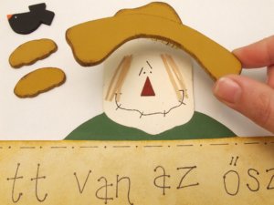 4. A madárijesztő orrát ragasszuk a szemek alá, majd a raffiából vágjunk le néhány szál, kb. 4 cm hosszú darabokat, és ragasszuk a madárijesztő arca köré. A kalap karimáját ragasszuk a madárijesztő fejéhez, a kezeket pedig ragasszuk a táblarész tetejéhez. A barna sizálból ragasszunk egy kis köteget a kalap peremére, majd erre ragasszuk rá a varjút is.