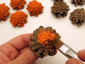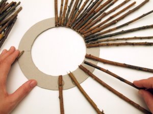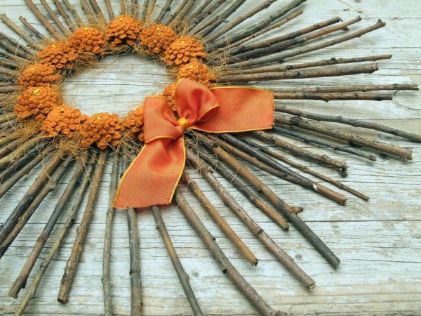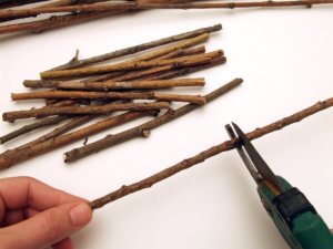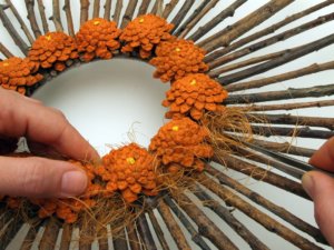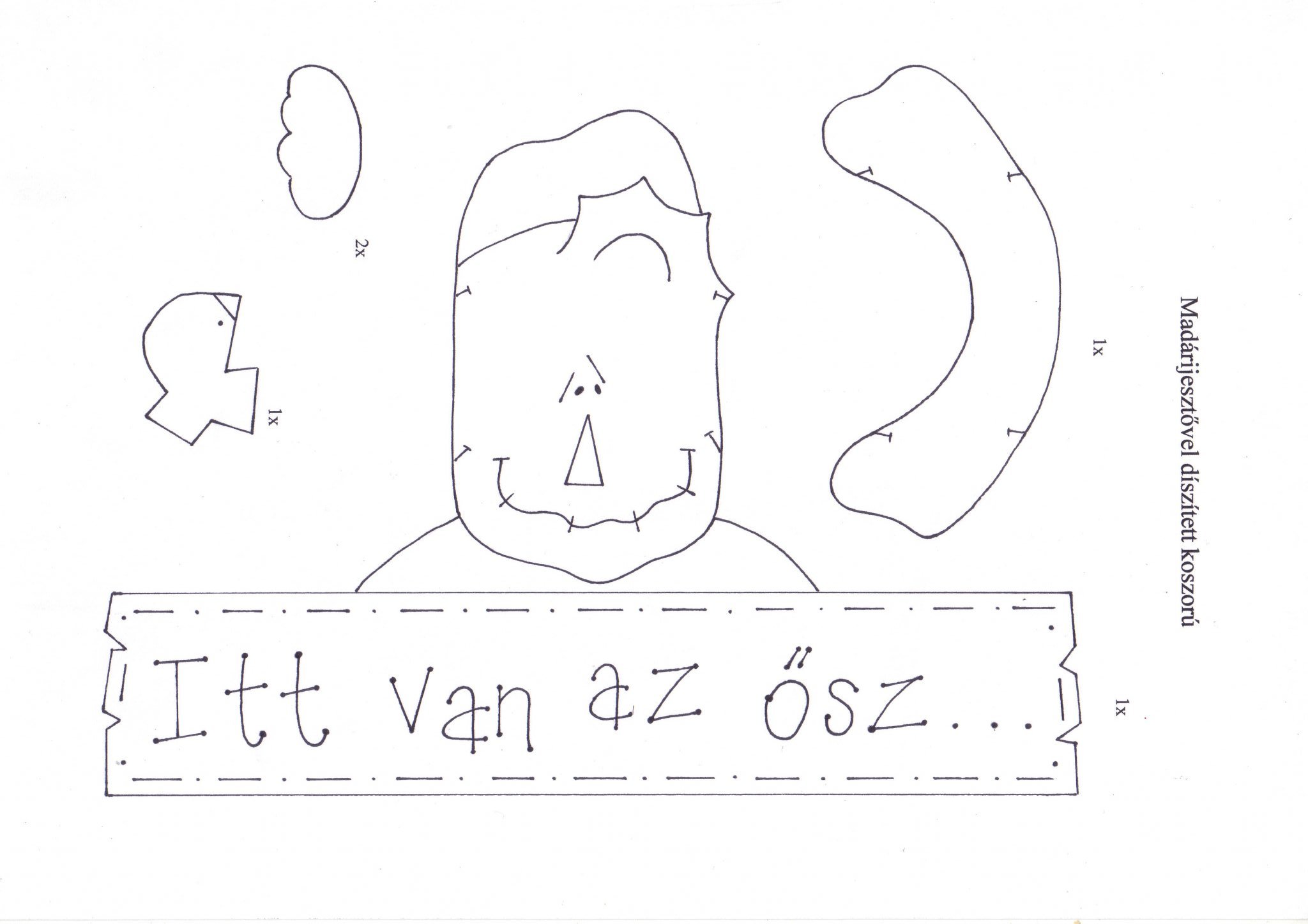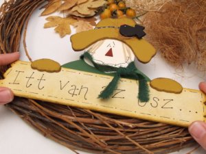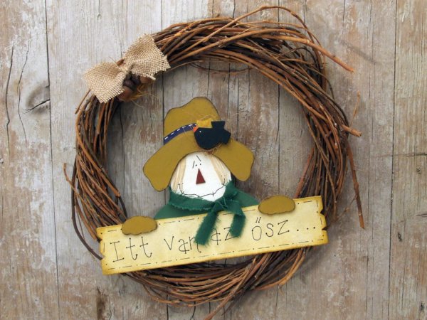 Kellékek: madárijesztő fafigura, vessző koszorú, festékek, vékony fekete alkoholos filctoll, raffia, barna szizál, vékony zöld szalag, zsineg, zsákvászon szalag, őszi termések, ragasztó, matt lakk
