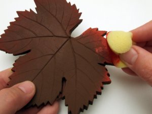 7. A kivágott napraforgó mintát ragasszuk a kalapjának a karimájára, és a közepére ragasszunk egy fagombot.