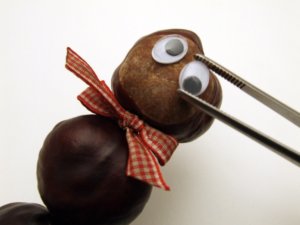 6. A háromszög alakú orrot ragasszuk a madárijesztő arcának a közepére. Fölé ragasszunk egy-egy mozgó szemet, és fekete alkoholos filctollal rajzoljunk neki egy szájat is.