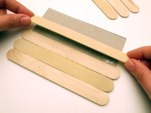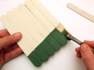 1. A fából készült madárijesztő táblarészét fessük drapp színűre, majd száradás után szivaccsal vigyünk fel rá okkersárga színű festéket, amit elszórtan nyomogassunk a falapra. Ezután egy ecsettel a széleket is húzzuk át ugyanezzel a színnel. Ezáltal kicsit foltos, de egybeolvadó felületet kapunk.