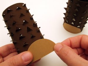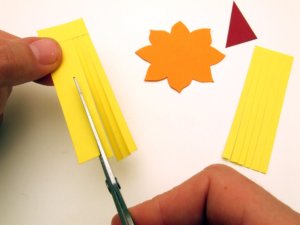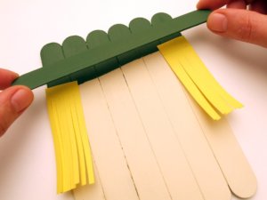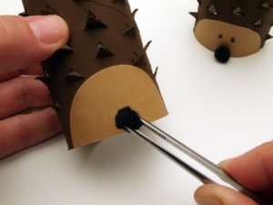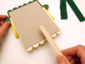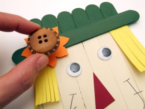 4. A madárijesztő orrát ragasszuk a szemek alá, majd a raffiából vágjunk le néhány szál, kb. 4 cm hosszú darabokat, és ragasszuk a madárijesztő arca köré. A kalap karimáját ragasszuk a madárijesztő fejéhez, a kezeket pedig ragasszuk a táblarész tetejéhez. A barna sizálból ragasszunk egy kis köteget a kalap peremére, majd erre ragasszuk rá a varjút is.