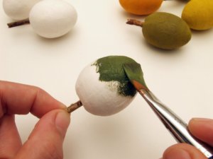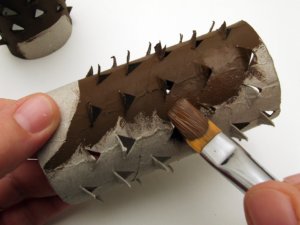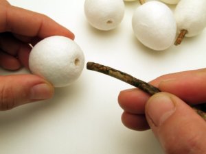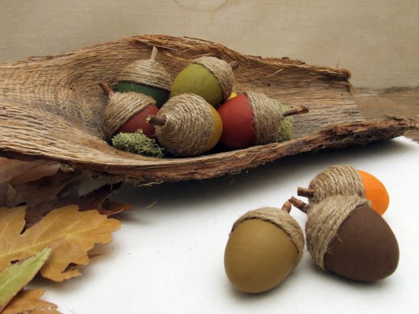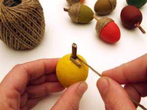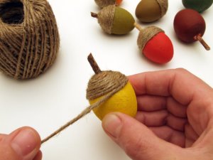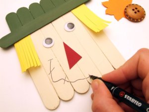Kellékek: madárijesztő fafigura, vessző koszorú, festékek, vékony fekete alkoholos filctoll, raffia, barna szizál, vékony zöld szalag, zsineg, zsákvászon szalag, őszi termések, ragasztó, matt lakk